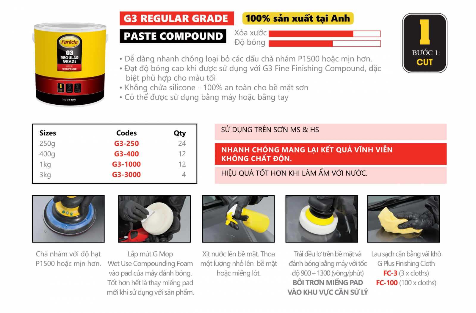 Lơ đánh bóng Farecla G3 Regular Grade Paste Compound là dòng compound gốc nước chuyên dùng trong bước 1 để xử lý các khuyết điểm bề mặt sơn. Sản phẩm được sử dụng rộng rãi trong các nhà máy sản xuất ô tô (OEM) nhờ hiệu suất ổn định và khả năng cắt xước nhanh.